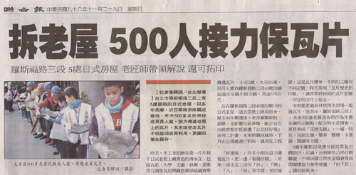 由綠色公民行動聯盟、中華民國自然步道協會、台灣創意生活美學促進會、樸門永續發展協會、中華民國社區營造學會、主婦聯盟環境保護基金會、社區大學全國促進會、與本團隊(經典工程顧問有限公司)共同發起舉辦的「百人接力傳瓦情˙老屋舊料再利用」活動,11月28日在超過500名市民朋友熱情參與下展開,綿延的人龍傳遞著歷史的瓦片,親子同樂的畫面留下了深刻的社區回憶。